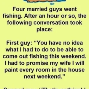 Four married guys go fishing… After an hour, the following conversation took place: **First guy:** “You have no idea what I had to do to be able to come out…