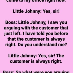 Boss: (Shouting) Little Johnny, come to my office immediately. Little Johnny: Yes, sir! Boss: Little Johnny, I noticed you arguing with the customer who just left. I’ve told you before that the customer…