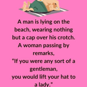 A man is lying on the beach, wearing nothing but a cap over his crotch. A woman passing by remarks, “If you were any sort of a gentleman, you would…